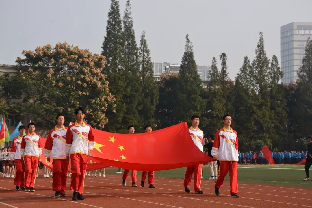 随着激动人心的音乐,国旗队、校旗队、花束队、导旗队、各学院代表队以及教工方阵依次入场。