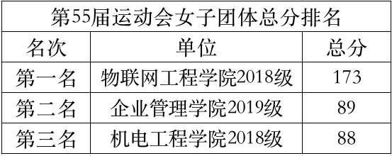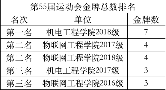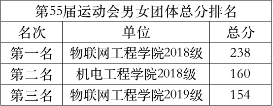 在为期一天半的比赛中,运动员们尽情挥洒汗水,用顽强拼搏彰显新时代水之子们的青春与活力。经过紧张激烈的角逐,机电工程学院2018级代表队取得了金牌总数第一的优异成绩,物联网工程学院2018级代表队,机电工程学院2018级代表队,物联网学工程学院2019级代表队分获学生组团体总分前三名,物联网工程学院2018级代表队,机电工程学院2017级代表队,物联网工程学院2019级代表队分获学生男子组团体总分前三名,物联网工程学院2018级代表队,企业管理学院2019级代表队,企业管理学院2017级代表队分获女子组团体总分前三名,机电工程学院分工会,物联网工程学院分工会,企业管理学院分工会分获教职工组前三名,物联网工程学院2019级代表队等六个团体分获精神文明奖一二三等奖。 值得一提的是,来自物联网工程学院16级自动化专业的聂小松同学以4分24秒99的成绩打破了学生男子组1500米预决赛的校区纪录,摘得桂冠,成为本次运动会上最闪亮的焦点。