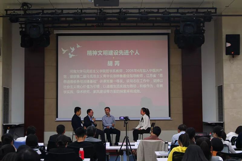 最后,在“模范人物访谈”环节,河海大学“三育人”先进个人赵煦老师、河海大学精神文明建设先进个人胡芮老师、河海大学优秀共产党员张小龙老师应邀做了精彩的分享.