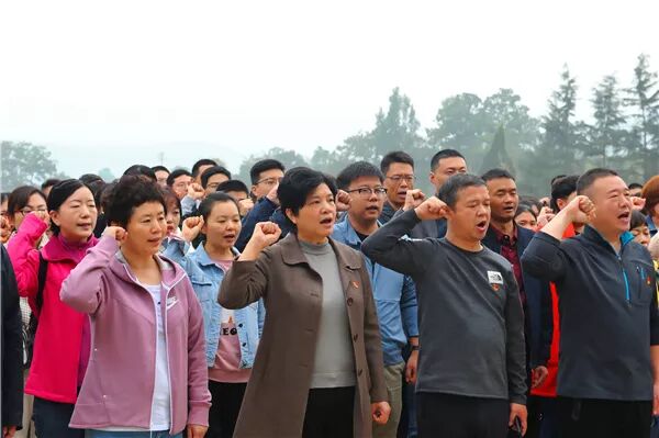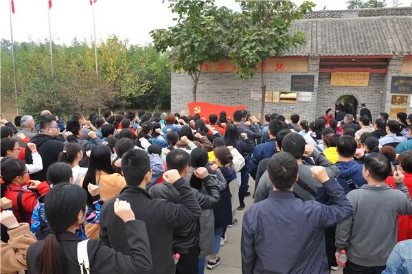 “我志愿加入中国共产党,拥护党的纲领,遵守党的章程……” ,在河南(豫西)抗日根据地纪念馆广场,面对鲜红的党旗,全体党员干部举起右臂,在院长孙世龙同志的带领下庄严宣誓,重温入党誓词。