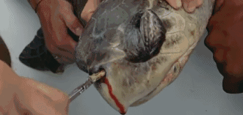 救助人员使用镊子、钳子,都无济于事。只要稍一触碰,它就会血流不止。 这个救助过程,海龟都痛苦不堪,整整8分钟后,才把长达10cm的东西拉扯出来。
