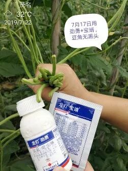 今年龙灯团队尝试在长豆角花期使用龙灯宝靖2000倍加劲勇1000倍喷雾,后期长出的豆角没有黑头,农户看了直夸赞?