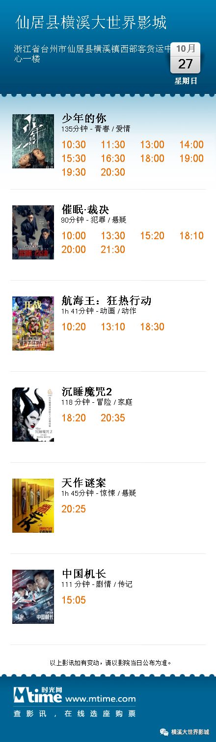 【横溪大世界影城】10月27日-28日影讯【场次以票房显示为准】】