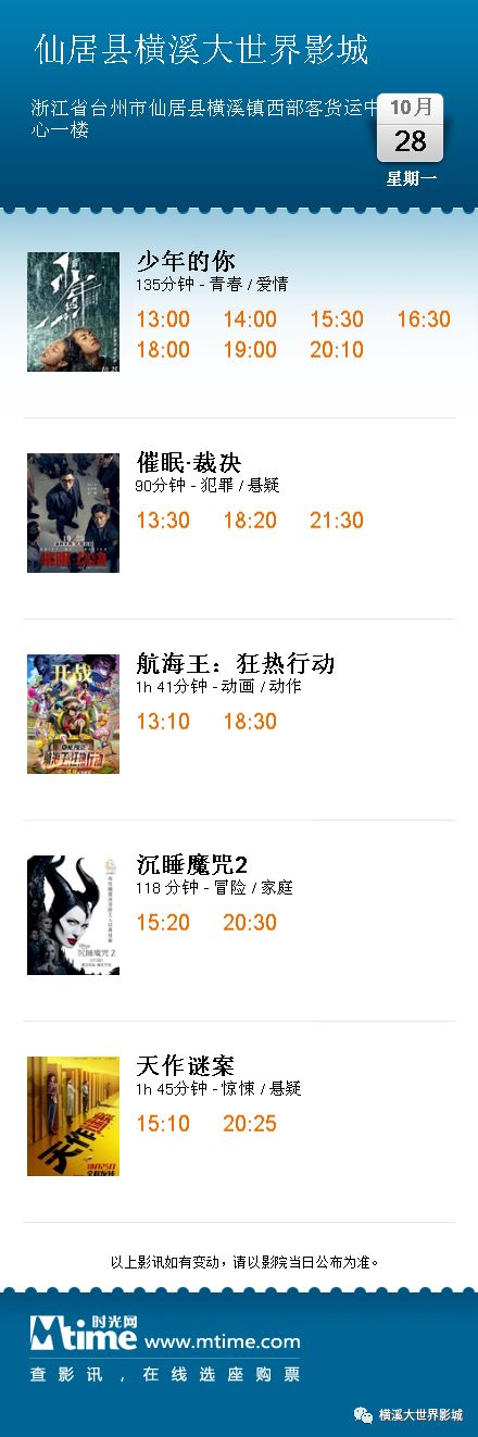 黄岩自力10月27日-10月28日影讯【场次以票房显示为准】