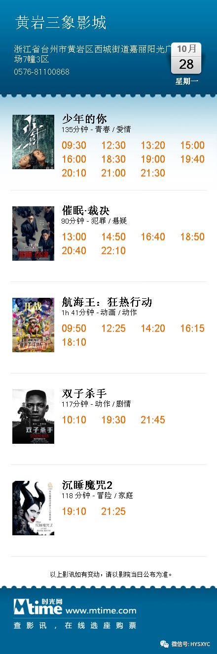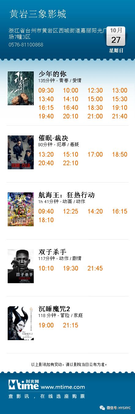『黄岩三象影城』10月27-28日影讯【场次准以票房显示为准】