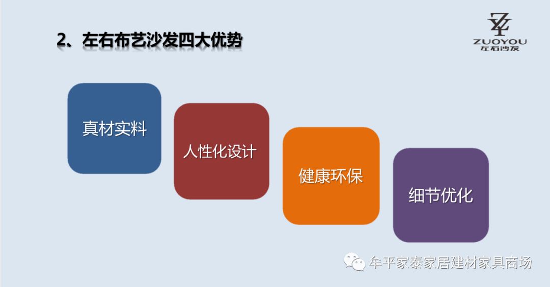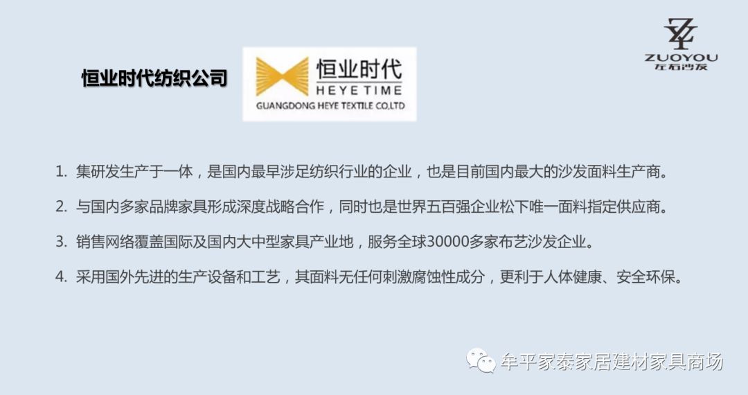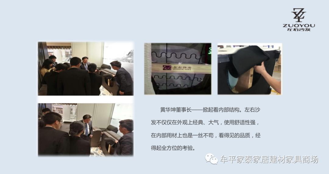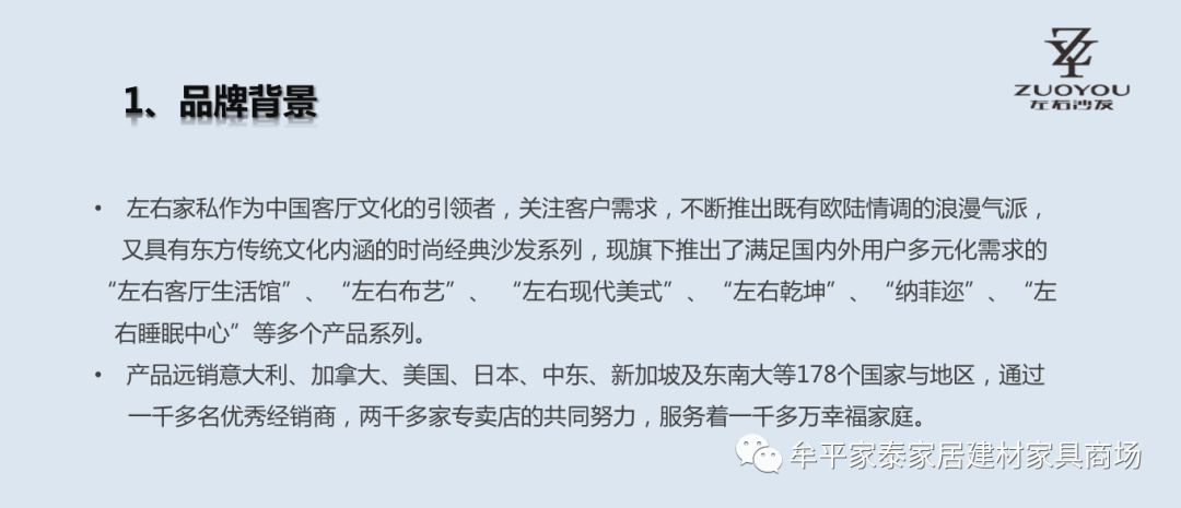 左右家私作为中国客厅文化的引领者,关注客户需求,不断推出既有欧陆情调的浪漫气派,又具有东方传统文化内涵的时尚经典沙发系列,现旗下推出了满足国内外用户多元化需求的“左右客厅生活馆”、“左右布艺”、 “左右现代美式”、“左右乾坤”、“纳菲迩”、“左右睡眠中心”等多个产品系列。 产品远销意大利、加拿大、美国、日本、中东、新加坡及东南大等178个国家与地区,通过一千多名优秀经销商,两千多家专卖店的共同努力,服务着一千多万幸福家庭。