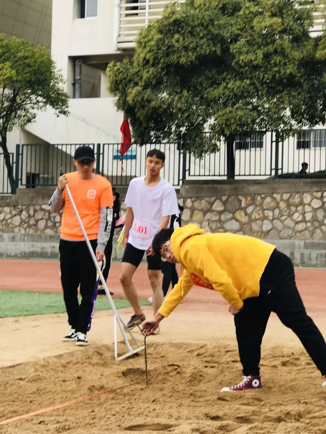 记不清已经多久没有参加过校运会裁判工作了。和杨美芬 、吕荣老师一起担任田赛二组裁判,负责跳远的今年,感觉特别开心。同组的还有孙家祥、尹文冲、张文靖、钱柠檬、张健、胡俊舒等研究生及本科同学。