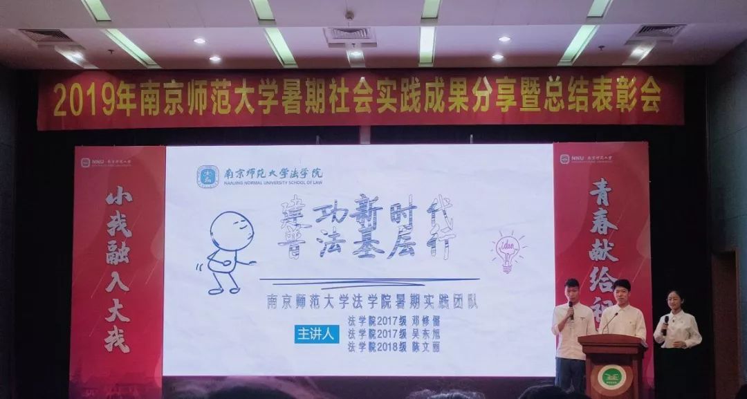 在本次表彰大会中南师大法学院荣获优秀组织奖、突出宣传成果奖,院内师生荣获杰出个人、优秀指导老师等多项奖项。其中“江苏家事纠纷法院调解机制实证与创新研究”团队获一等奖;“法治化营商环境构建的实证研究——以经济纠纷、经济犯罪为视角保护民营企业产权”等三个团队获二等奖;“后千禧世代”网络司法保护研究——基于短视频 APP 隐性侵权对未成年人权益的冲击等两篇文章获优秀研究报告一等奖;陈爱武等四位老师获优秀指导教师。在暑期社会实践成果分享阶段,邓修儒、吴东旭和陈文丽三位同学,深入基层,奔赴苏北苏中苏南地区,了解普法现状,发掘潜在困境的情况,对“建功新时代,普法基层行”课题做出深刻体会。