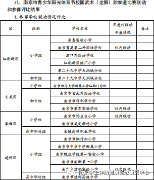 3.还要特别表扬南京晓庄学院第一实验小学、高淳区宝塔小学、南京市小行小学、中华中学附属小学、南京市翠屏山小学、南京市东山小学、江北新区浦厂小学、南京市紫东实验学校高度重视校园体育文化建设,校长在晨会上为参赛学生亲自颁发获奖证书,或组织专题汇报展演活动。