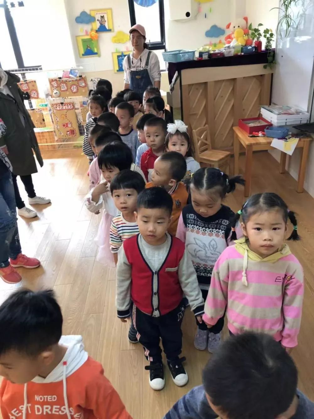 孩子们分散在几位老师身边,听老师介绍蝴蝶的触角以及翅膀的形状、颜色,还有听老师说破茧成蝶的故事。