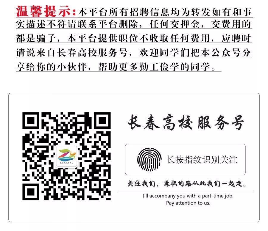 【工作要求】要求交际能力较强,18岁~35岁以下,要求是女生。最好是净月大学城在校女生