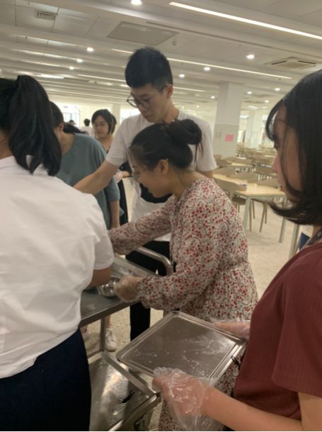 在开学初,学校食堂人力不足的情况下,青年教师在青年教师教育研究会的组织下,自发分组分工走进食堂,在小学生放学前的半小时将饭和汤打好,摆放在餐桌上,切实保障了小学生就餐的有序性及安全性。