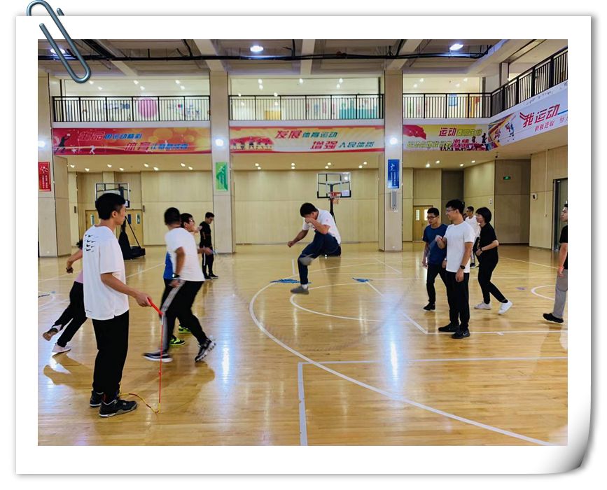 2019年10月23日8:00,体育组老师在艺体馆进行跳绳培训。胡平生老师为体育组老师指导跳绳。