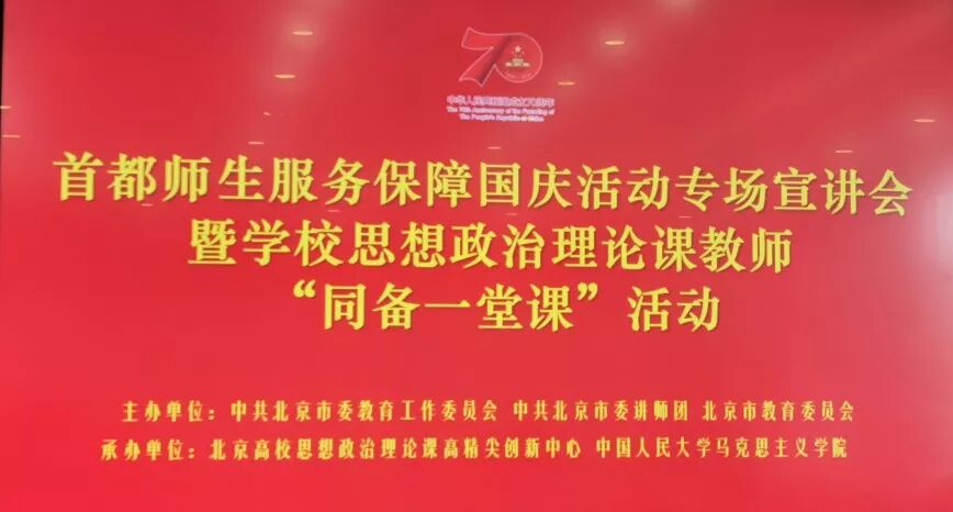 2019年10月27日,首都师生服务保障国庆活动专场宣讲会暨学校思想政治理论课教师“同备一堂课”活动在中国人民大学举行。为深入贯彻落实习近平总书记国庆系列重要讲话和批示精神,认真做好首都教育系统服务保障国庆活动宣传推广工作,持续唱响爱国主义教育时代强音,我校积极组织教师在校集体收看直播,认真学习会议精神。