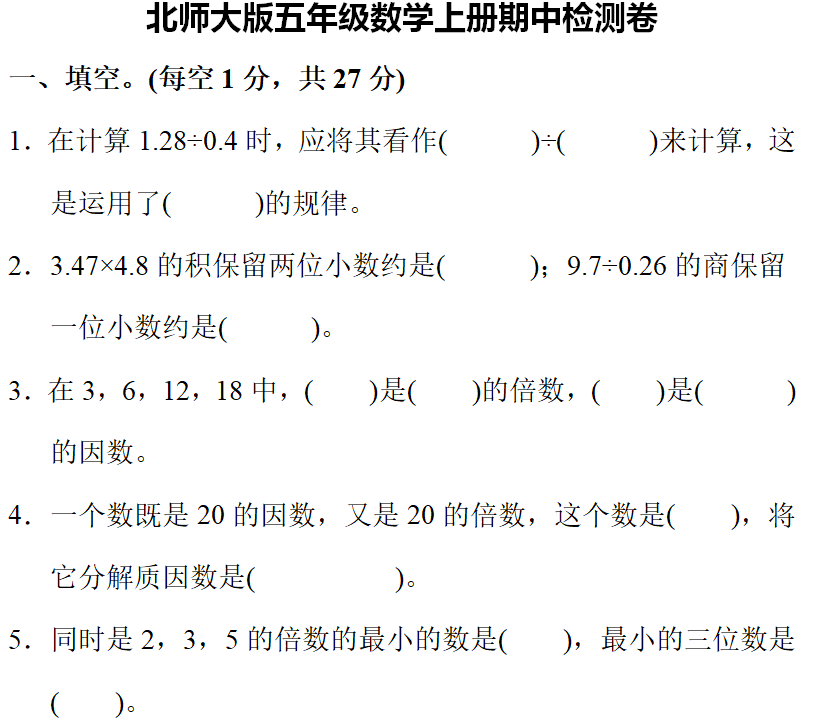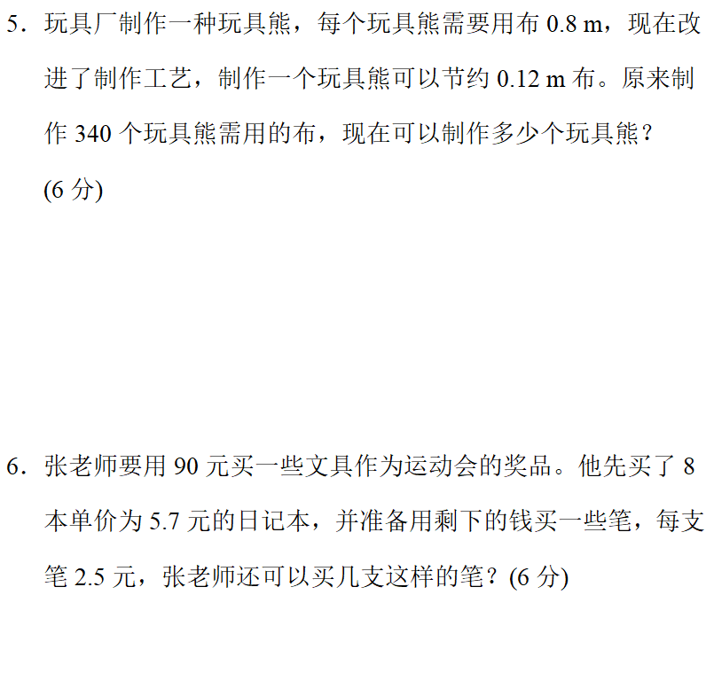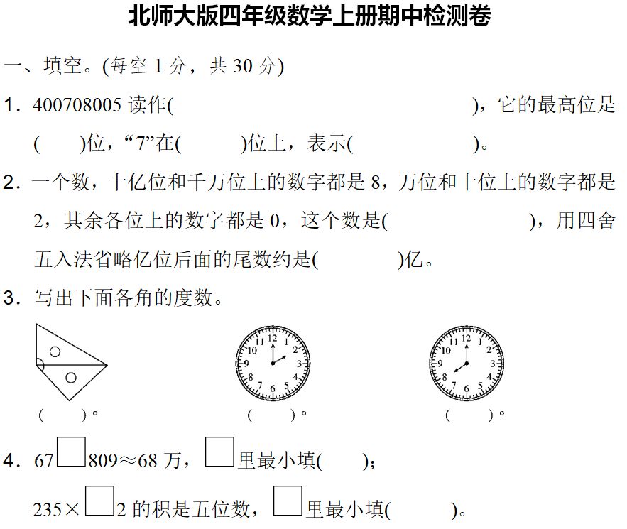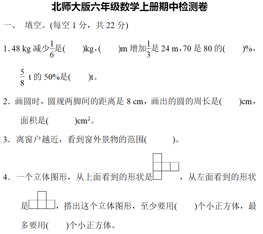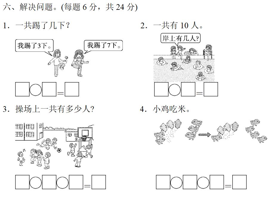10、人教版小学数学1至6年级上册期中试卷(可下载)