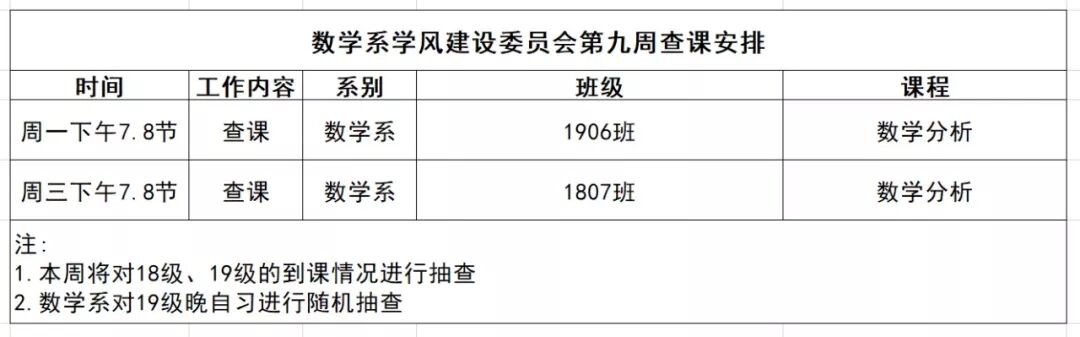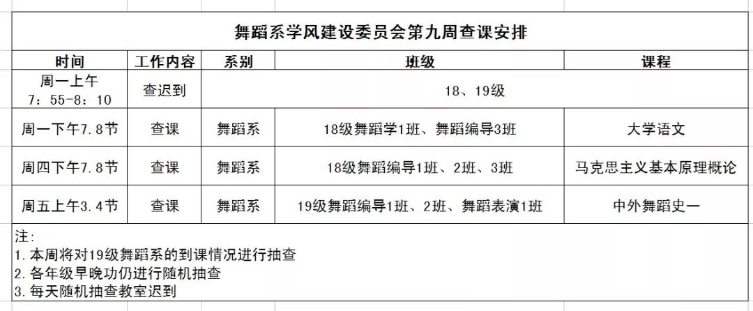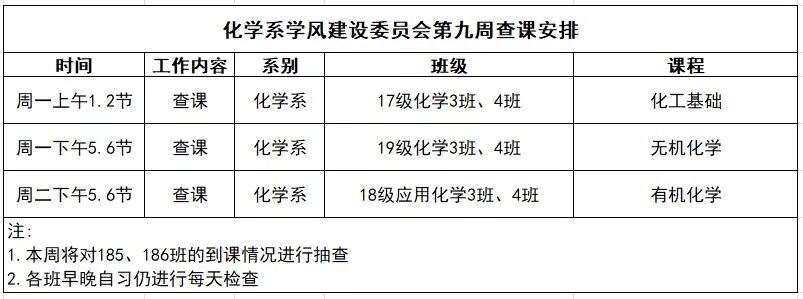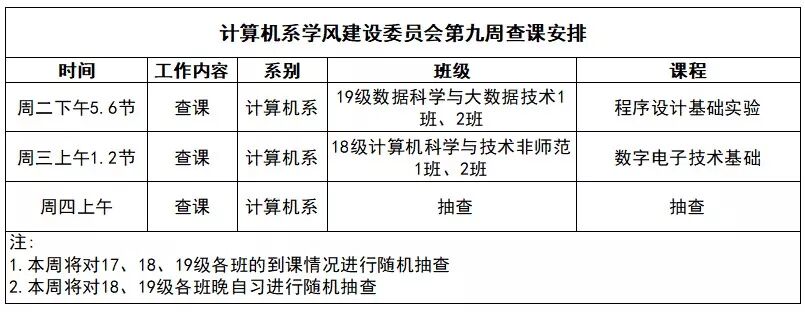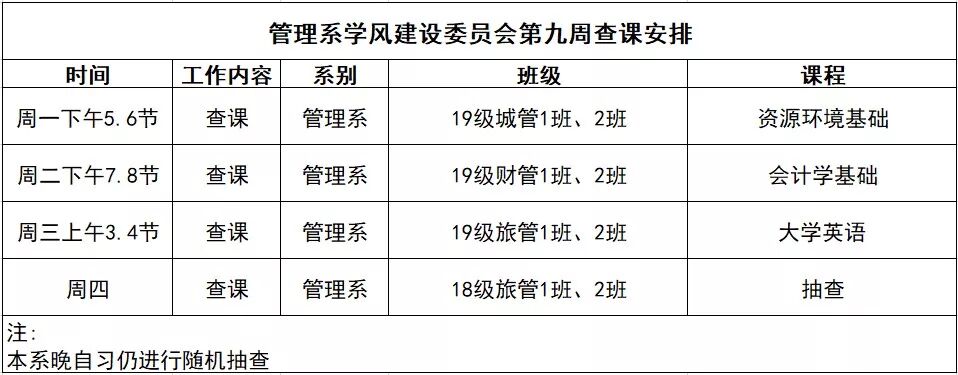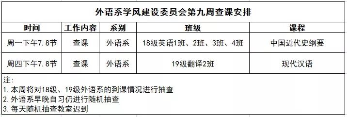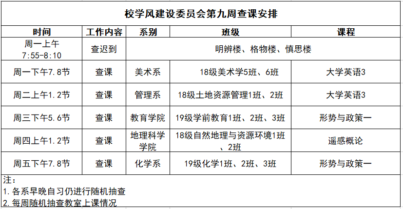 各二级院、系学风建设委员会第九周协助老师查课安排如下: