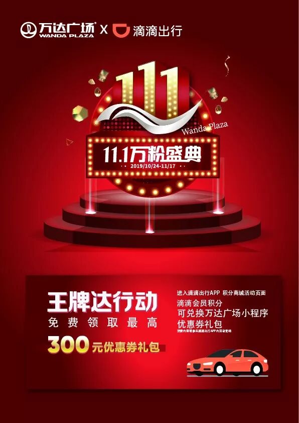 为了更好的提升消费者的购物体验,万达广场着力探索“1+1>2”的合作摸木。本次“11.1万粉盛典”在滴滴、顺丰等平台共同联手打造“王牌达行动”、“寻找丰衣族”活动中,从出行、配送两方面进一步补充大众消费者线下需求,为消费者打造极致购物体验。由大数据驱动,洞察消费者需求,实现全渠道营销打通是“11.1万粉盛典”万达广场与滴滴打造“王牌达行动”的初衷。11月01日至11月17日期间,消费者登录滴滴出行app,在滴滴积分商城内,就能够轻松获取万达广场“11.1万粉盛典”折扣优惠券。