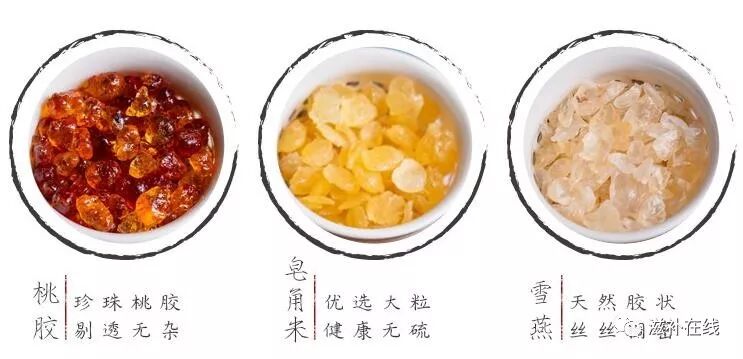1)桃胶、皂角米、雪燕分别用清水浸泡12个小时,然后挑出杂质。