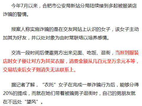 随后团伙会派出几位妙龄女子以聊天中对应的虚拟女性身份进行伪装,负责线下与男性进行见面。见面后,“衣托”女总是假装不经意地逛到犯罪团伙开的服装店,在店内进行购物。