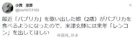 2:日本爸爸说他2岁的女儿最近开始学着唱「パプリカ」(红甜椒),然后愿意吃红甜椒了。因此他希望米津玄师明年再出一首叫「レンコン」(莲藕)的歌