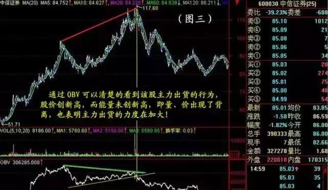 出现这种OBV急速下跌,阴量不断地涌出来,而股价并没有大幅下跌的时候,就要引起警惕,这是庄家一边维持着股价,一边加快速度出货,回档是难免的。