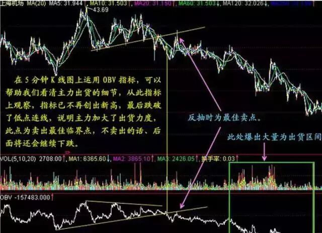用OBV判断主力庄家出货能量线OBV就是这样:你有红的阳量打进它就涨,如果老是绿的阴量出来它就跌,把5分钟OBV曲线的三个低点连成一条直线。