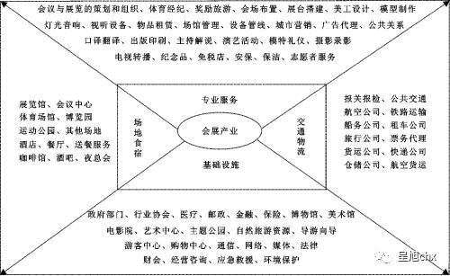 图1 产业融合视角下的旅游产业价值链(二)会展产业价值链分析1.会展产业。会展,字面上是会议与展览的集合。英文简称 MICE,包含:会议(meetings),企业或社团举办的研讨会或培训会议;奖励旅游(incentives tourism),为鼓励和提升员工表现,举办的旅游活动和聚会;年会(conventions),公司团体举办的大型年会;展览(exhibitions),以陈列和公开展示的形式,宣传和推广产品、科技和经营成果[8]。随着会展经济达到一定的规模和水平,对城市经济社会发展产生巨大的促进作用,会展产业从商务服务业脱颖而出,成为独立的产业形态。近年来,奥运会、世界杯和世界博览会等大型节事活动,也不断被纳入会展产业的范畴,因此会展产业也被称为会展节事产业[9]。会展产业是提供会议、年会、奖励旅游、展览、博览会、大型体育赛事等节事活动的策划、组织、管理及营销等相关服务的行业,形成了巨大的服务网络(见图2)。