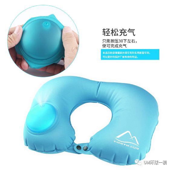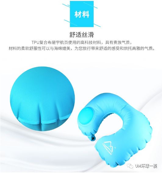 ? 本品用轻薄柔软TPU牛奶丝布复合,经高频热压成型。柔软舒适携带方便。手压充气,不用嘴吹,卫生高雅,已获实用新型专利。