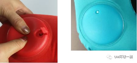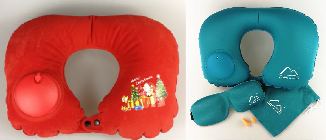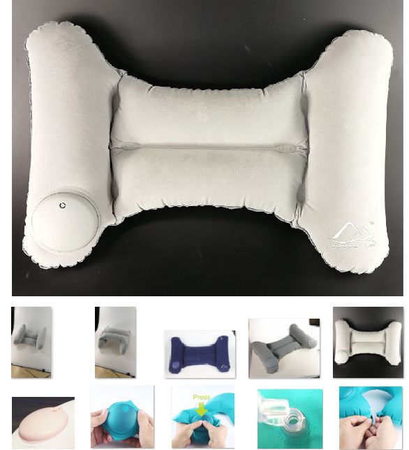 半裸式按压囊球,结合了TPU复合布或PVC植绒面料的高频机一模成型,改变了以往用嘴吹气的费力和不卫生状况,也突破了按压充气式旅行枕,内胆加外套的瓶颈。