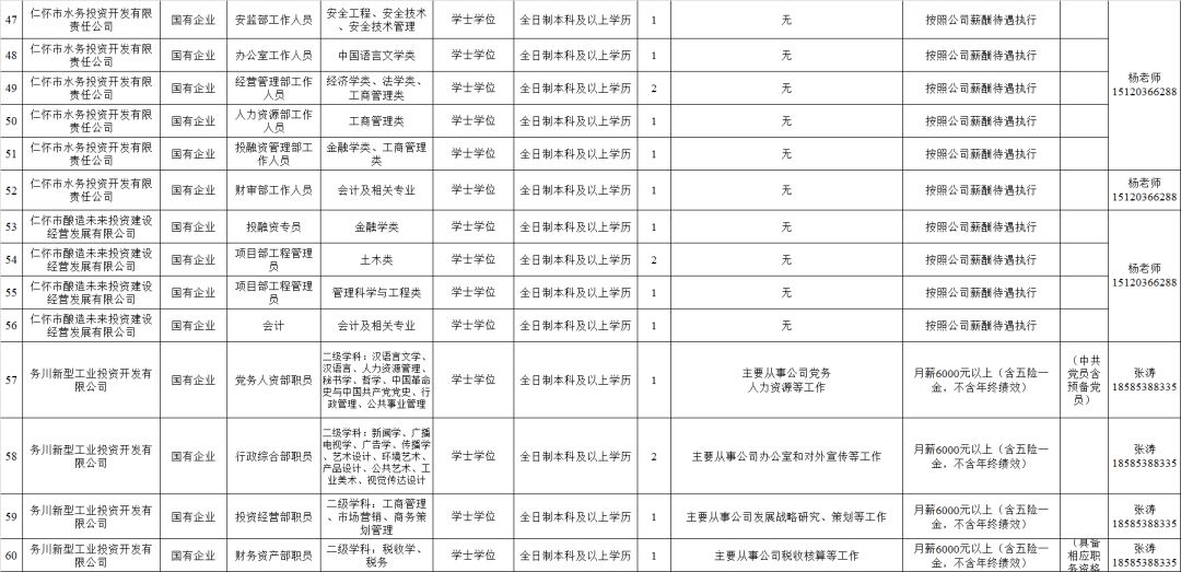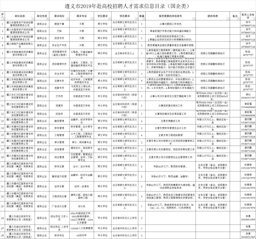 三、国有企业工作人员招聘条件国有企业工作人员招聘条件详见《遵义市2019年赴高校招聘人才需求信息目录》,最终解释权归企业所有。