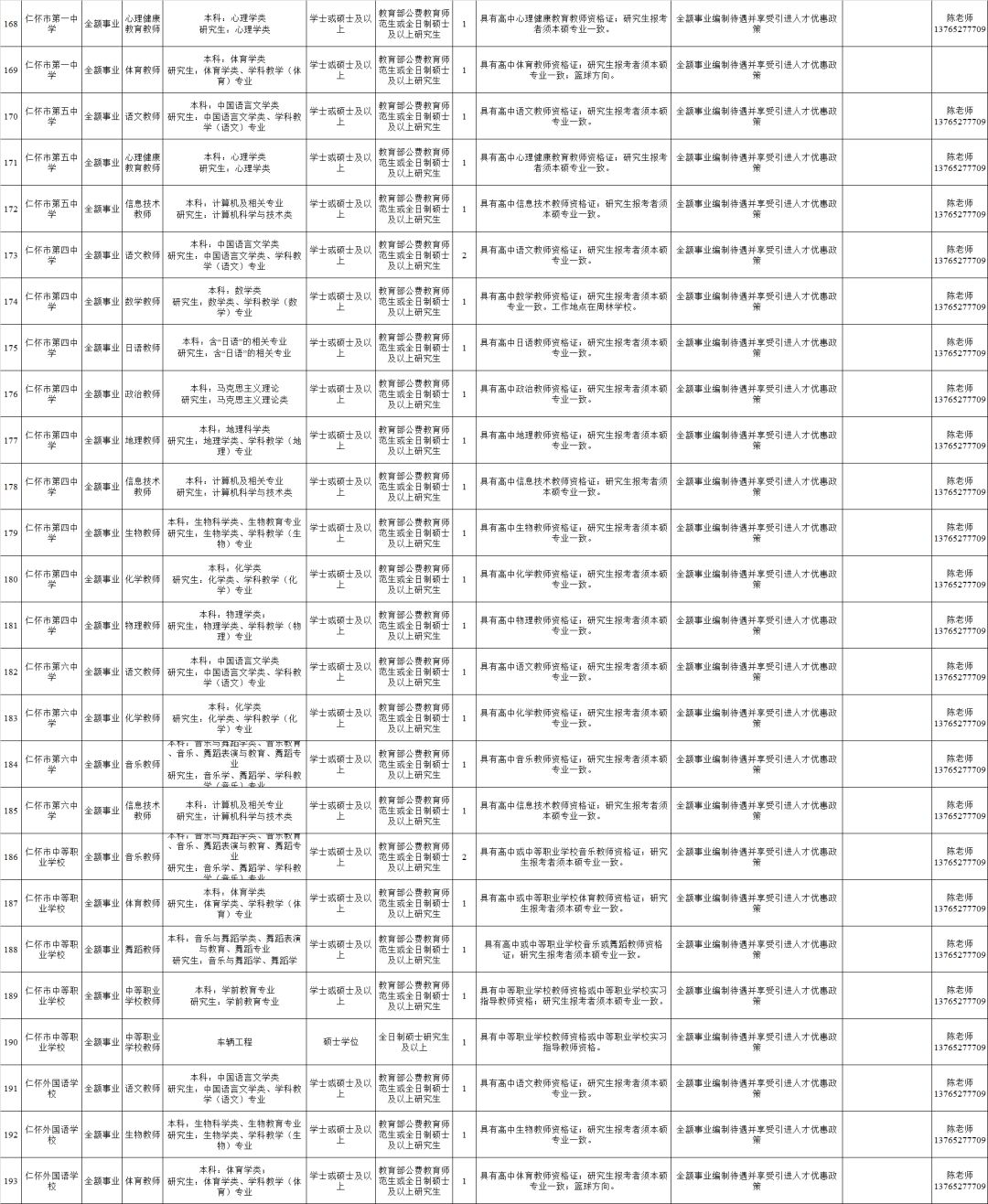 六、中小学教师岗位招聘职位及学科需求说明(一)师范生公费教育毕业生毕业证上的专业须与招聘学科一致(对照《普通高等学校本科专业目录新旧专业对照表》,对照表中对应的原专业可视为新专业),其中:物理学(070201)、化学(070301)、生物科学(071001)可报考小学科学职位;物理学(070201)、教育技术学(040104)、计算机科学与技术(080901)可报考通用技术职位。(二)研究生毕业证上的专业须为招聘学科对应的相关专业(对照《授予博士、硕士学位和培养研究生的学科、专业目录》),其中:物理学(0702)、化学(0703)、生物学(0710)可报考小学科学职位;物理学(0702)、计算机科学与技术(0812)、教育技术学(040104)、现代教育技术(045114)可报考通用技术职位。(三)报考“不限任教学科岗位”者(职位表需求岗位标注为高中教师、中职教师、初中教师、小学教师、科学不限等),毕业证上的专业须与任教学科一致(公费教育师范)或相近专业(硕士研究生),且必须是该岗位对应学段开设的学科。(四)硕士及以上学历报考人员所学专业未在专业目录所列的或者专业名称相似或相近的,并且所学专业必修课程与报考职位要求的专业的主要课程基本一致。以国内学历学位报考的,应提供所学专业课程成绩单(教务处盖章)及毕业院校设置专业的依据等材料;以国(境)外学历学位报考的,应提供成绩单的中文翻译文件等材料。对于特殊专业,由市人社局、市教育局商议决定是否符合专业要求,认定为符合专业要求的由两家单位在招聘会现场签字备查。