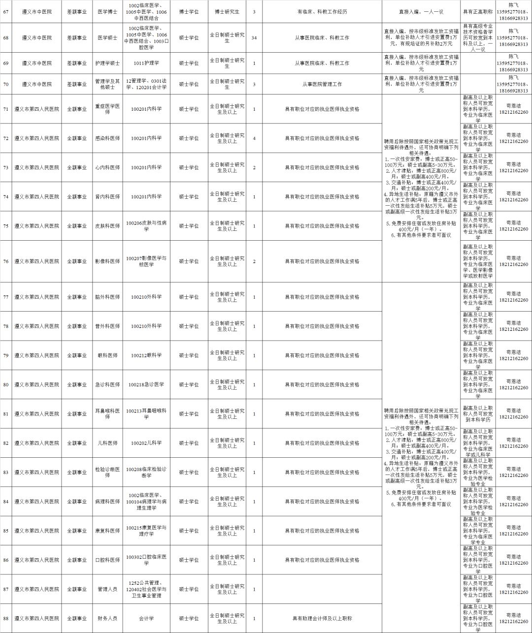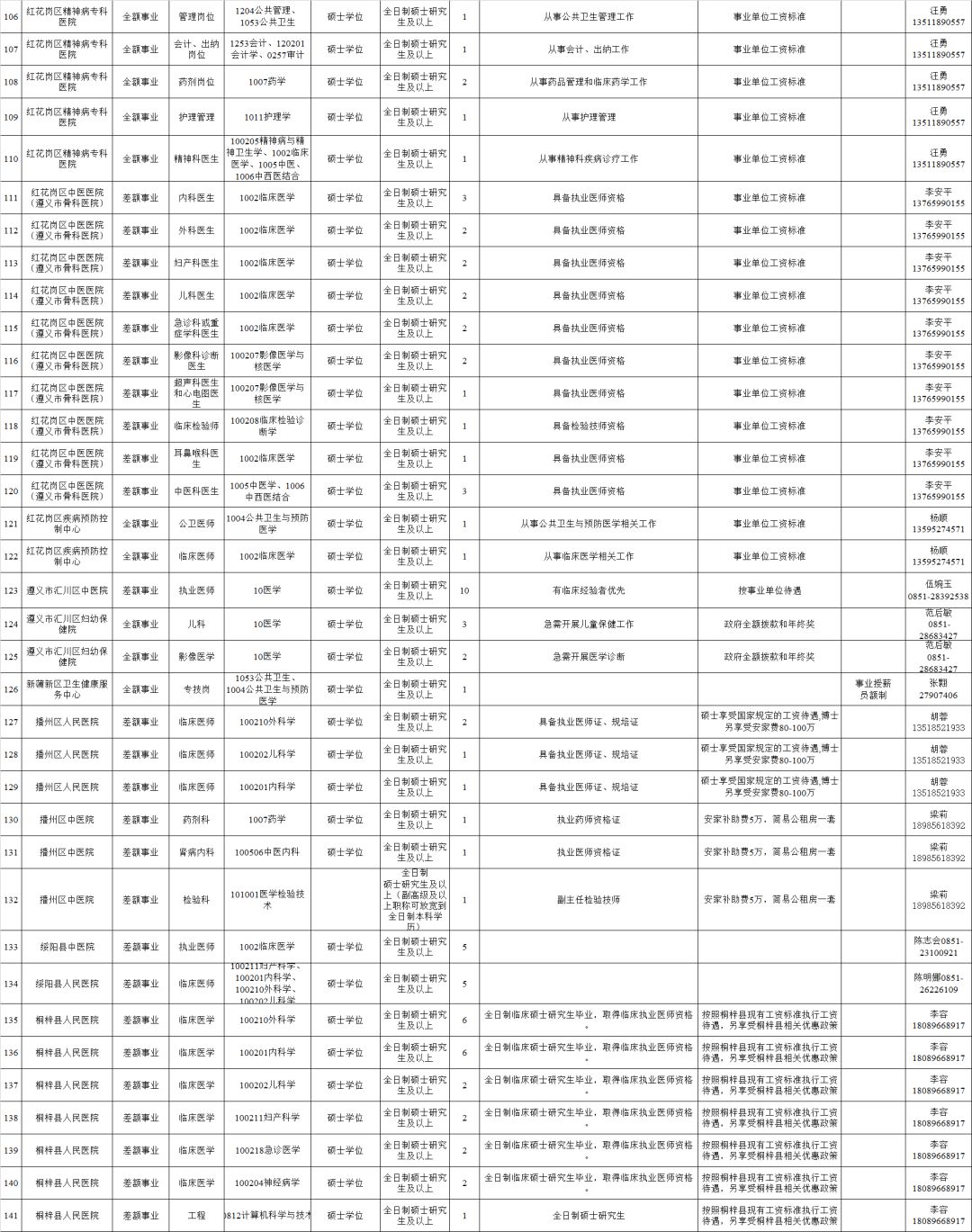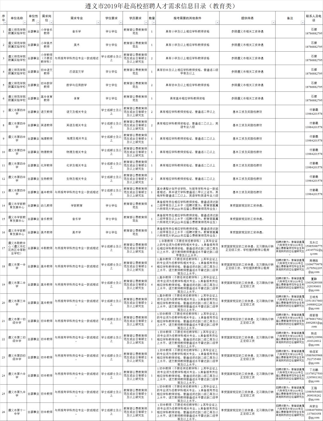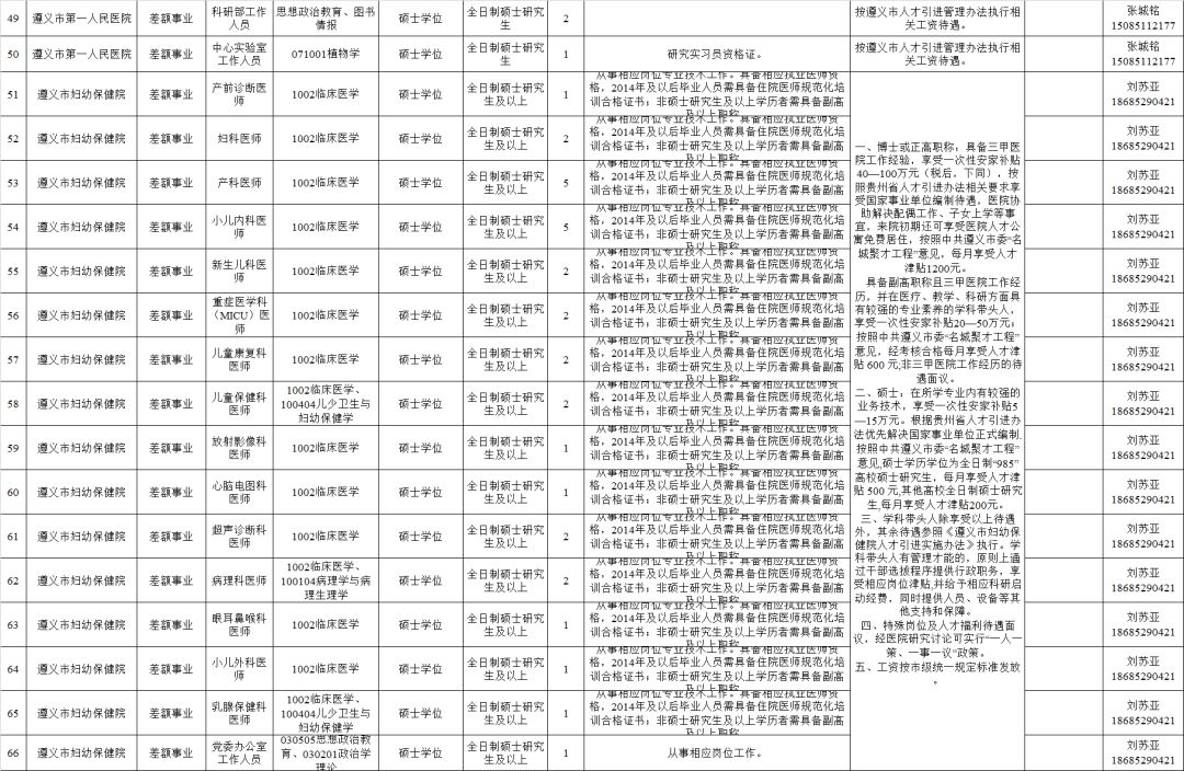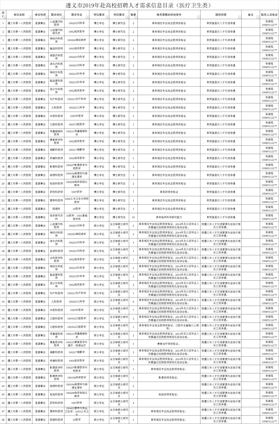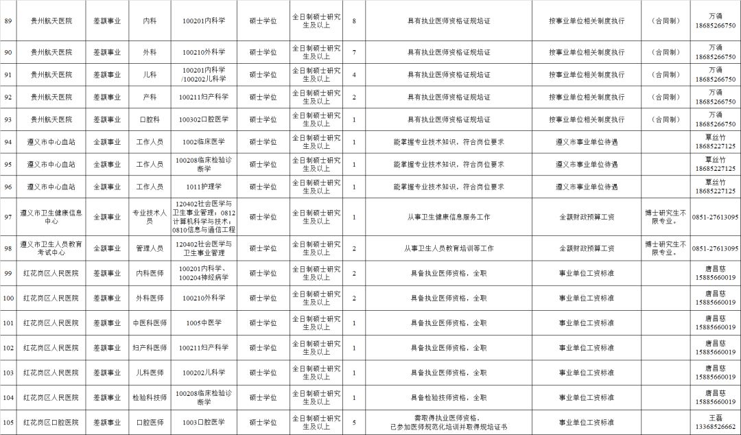 2.全日制普通高校2020年及以前毕业的拥有硕士研究生及以上学历和学位毕业生(含具有教育部认可的海外硕士研究生及以上学历学位人员)。(二)全市卫健系统计划招聘医疗卫生人员614名,其他事业单位计划招聘工作人员248名,招聘对象为全日制普通高校2020年及以前毕业的拥有硕士研究生及以上学历学位人员(含具有教育部认可的海外硕士研究生及以上学历学位人员)和职位对应的副高级及以上专业技术职务人员。(三)国有企业计划招聘工作人员128名,招聘对象为全日制大学本科以上学历的相关专业人员。招聘单位、岗位、学历、专业、职称、数量等具体条件详见附件1:《遵义市2019年赴高校招聘人才需求信息目录》。