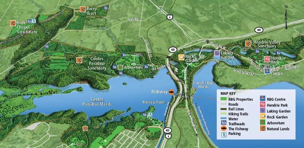 加拿大皇家植物园(Royal Botanical Gardens)地处Burlington 市和 Hamilton 市的交界处,占地 2700 多英亩,紧邻湖湾。皇家植物园始建于 1930 年,是加拿大国家级的历史名园,有五个引以自豪的圃园 (RBG Centre, Hendrie Park Gardens, Rock Garden, Laking Garden, Arboretum)。