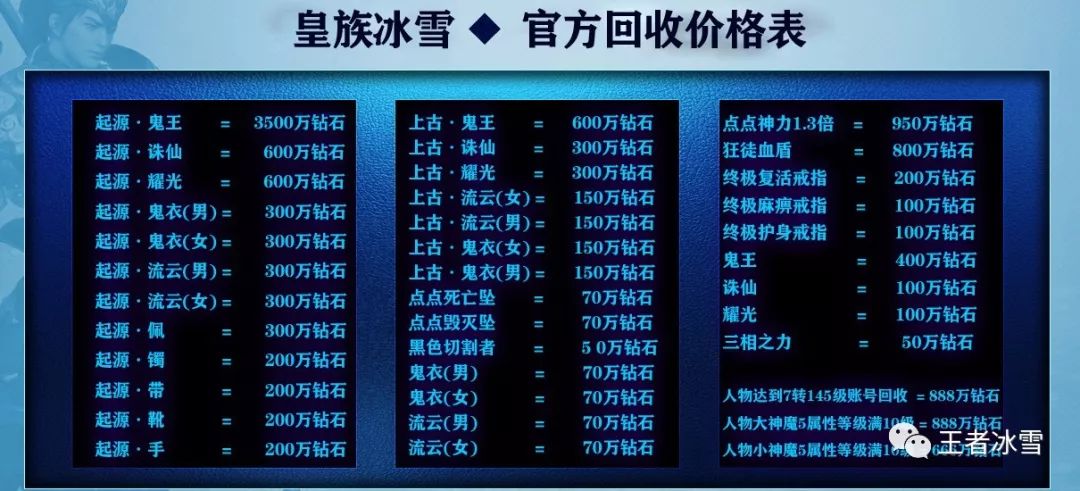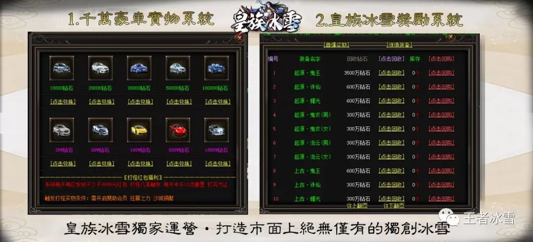 (很多玩家冲个几十块钱就想当几百,几千块钱的号玩.你想一想那可能吗?玩冰雪服连最基础的神魔都不点,一会说抗不住怪了,为啥人家打群怪都没事,人家的爆率怎么这么高呢?我们想说这个问题你还用问吗?最简单的起大3小5的号人家2天就回本了.你那还一天打100米呢.人家起号的一天几百米.那怎么跟别人比.本服有啥说啥,不管玩家爱听也好,不爱听也摆,本服不会玩什么套路,也不想坑任何一个玩家,现在开服的太难了,打金的玩家也太难了,还是内句话:每个服有每个服的玩法,感觉这个服不错那就玩玩,感觉不行那就换别的服玩,很简单的道理,不要对每一个服过多的评价!没有十全十美的东西,都会有一些瑕疵,不合胃口的东西.本服开区稳定,提现稳定,不想说太多.皇族冰雪:祝大家口袋越来越鼓.日子过的越来越好.)
