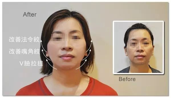 全脸提升,改善苹果肌下垂、脸颊下垂、眼角下垂、鼻唇沟、松垮的嘴边肉,能拉提嘴角上扬、立体下颔线条;