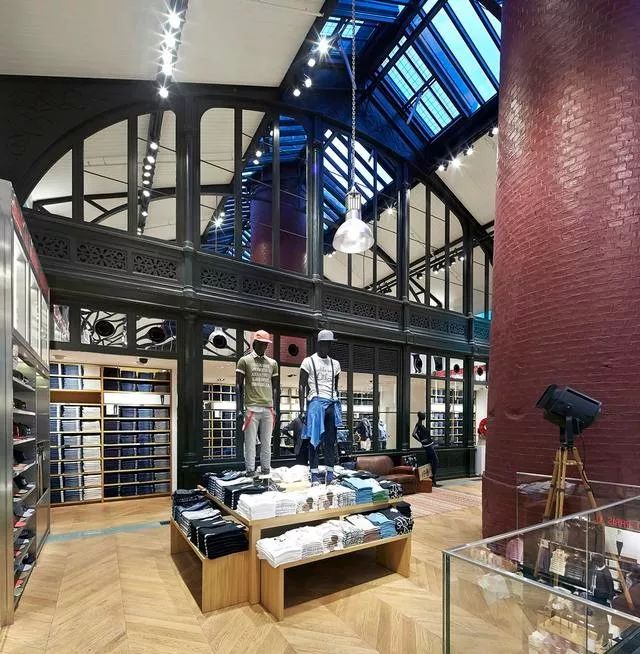是不是优衣库要开始走新的店铺设计理念了呢?答案是否定的,从图片中可以看出,被铁架框住的店铺,用上了粗斜纹装饰以及原始壁炉及工具做了陈设点缀,强调了这个空间的作用——零售。这种风格毫无疑问是属于优衣库的。而这个空间的“推陈出新”是为了彰显优衣库不断的独创性和它内在的能量。