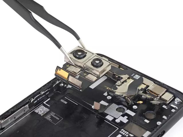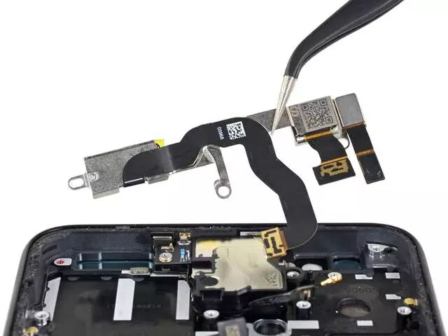 后置双摄连接在手机的左上角,连接的线缆分别进行“wide”和“tele”的标记;前置传感器包括一个800万像素摄像头以及生物识别硬件(包括两台分离良好的近红外(NIR)摄像机、一个NIR泛光发射器和一个NIR点投影仪),环境光传感器和屏幕连接在一起。