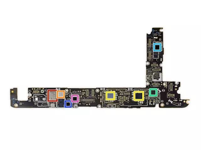 另一面是Skyworks Sky5-8212-11前端模块(红色)、高通QET5100(橙色)、高通PM8150和PM8150A PMIC(黄色)、STMicroelectronics ST54J NFC控制器(绿色)、Maxim MAX77826 配套PMIC(青色)、XSPT6 SMC85201 Z(蓝色)以及35L36CWZ BOCW1909(紫色)。