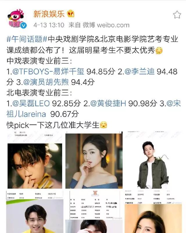 易烊千玺作为tfboys成员2013年就出道成功迅速火遍全国,那个时候的易烊千玺才13岁什么概念,13岁就赚到了一个普通人一生的积蓄,通过不懈的努力5年过后依然大红大紫,且以第一名的成绩被中央戏剧学院录取,在这里恭喜千玺。李兰迪、胡先煦二人也米让人失望,二人紧随其后分别以第二第三的好成绩,成功入驻中戏。