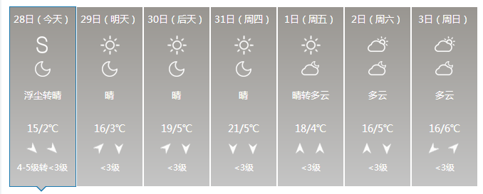 大风黄色及沙尘蓝色预警中。