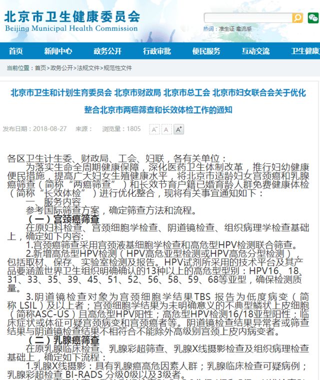 北京市适龄妇女可免费筛查两癌