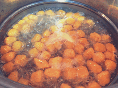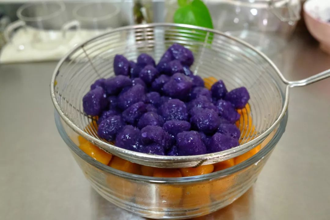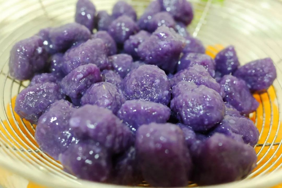 同样的操作,紫薯圆也来一遍,但记住,千万不能先煮紫薯圆,因为紫薯圆会把整锅水的颜色变成紫黑色,先煮它后面再煮红薯圆,就得另烧一锅水啦。