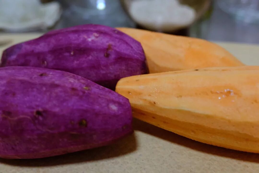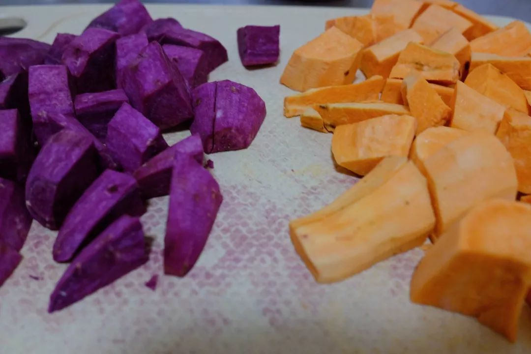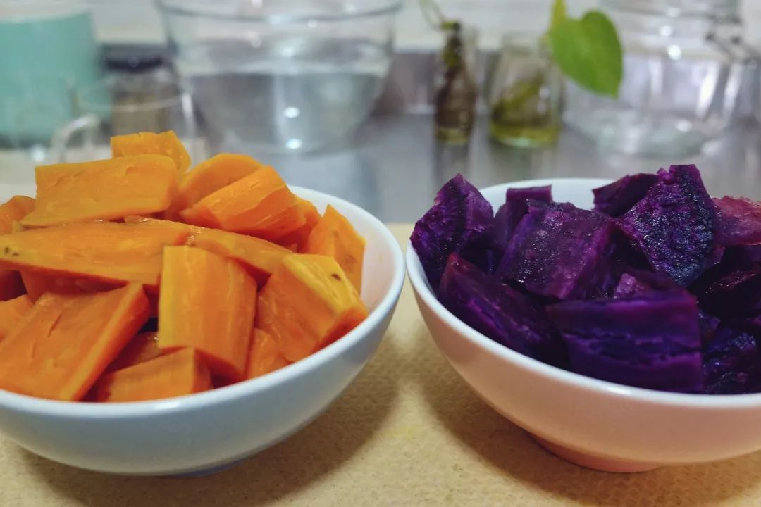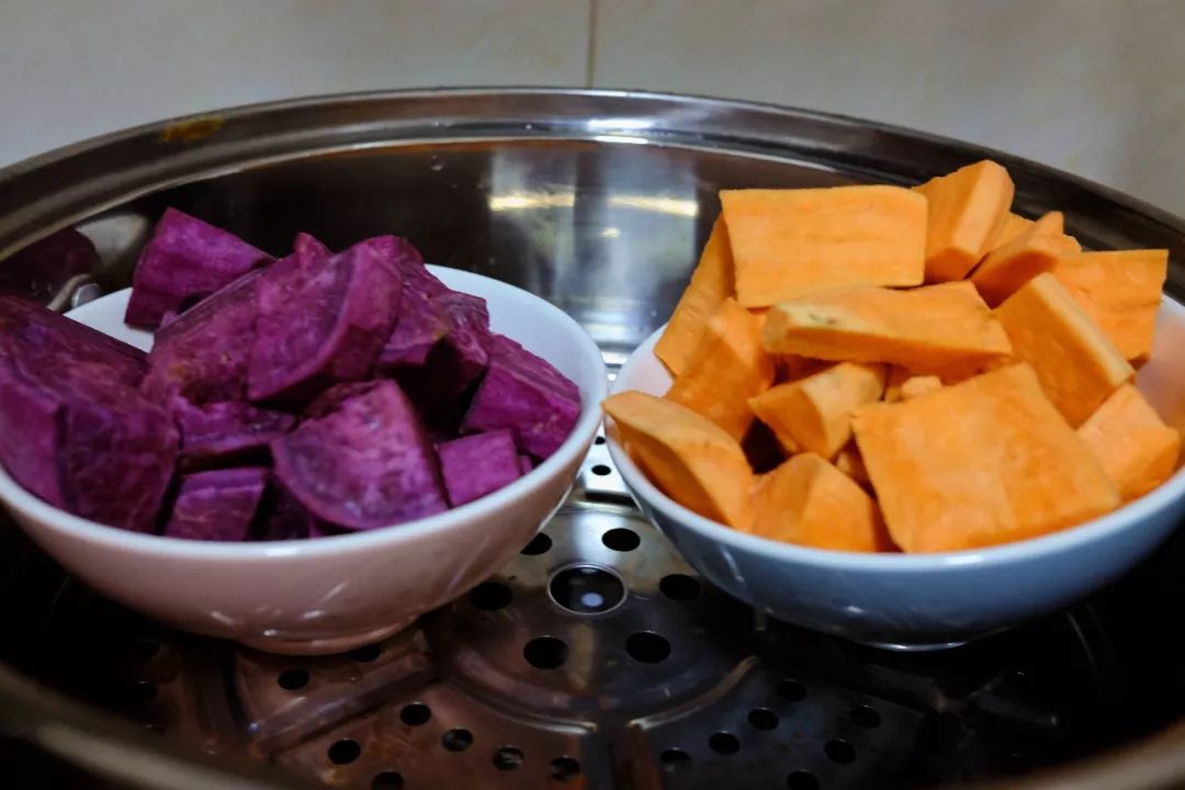 将红薯、紫薯分装在不同容器中,上锅蒸20分钟至熟透。
