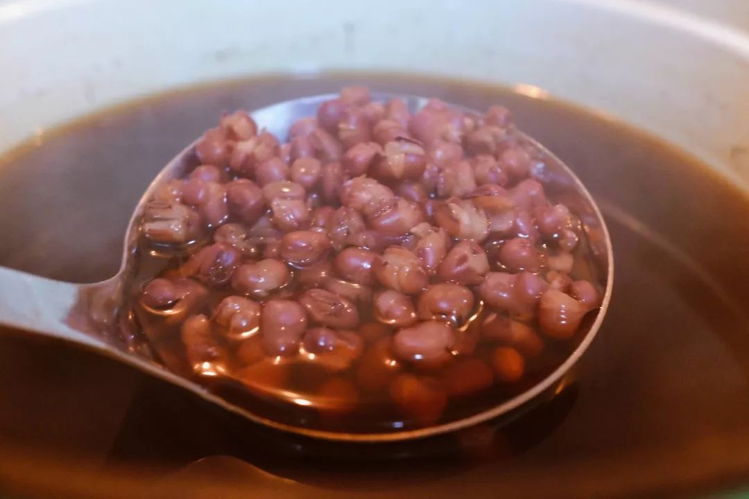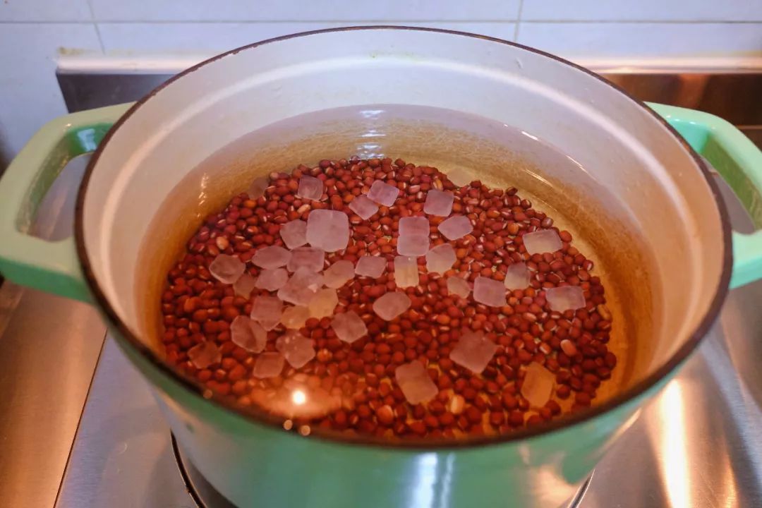 锅里加上提前泡好的红豆,再加入适量冰糖,加水煮成红豆汤后关火晾着,备用。