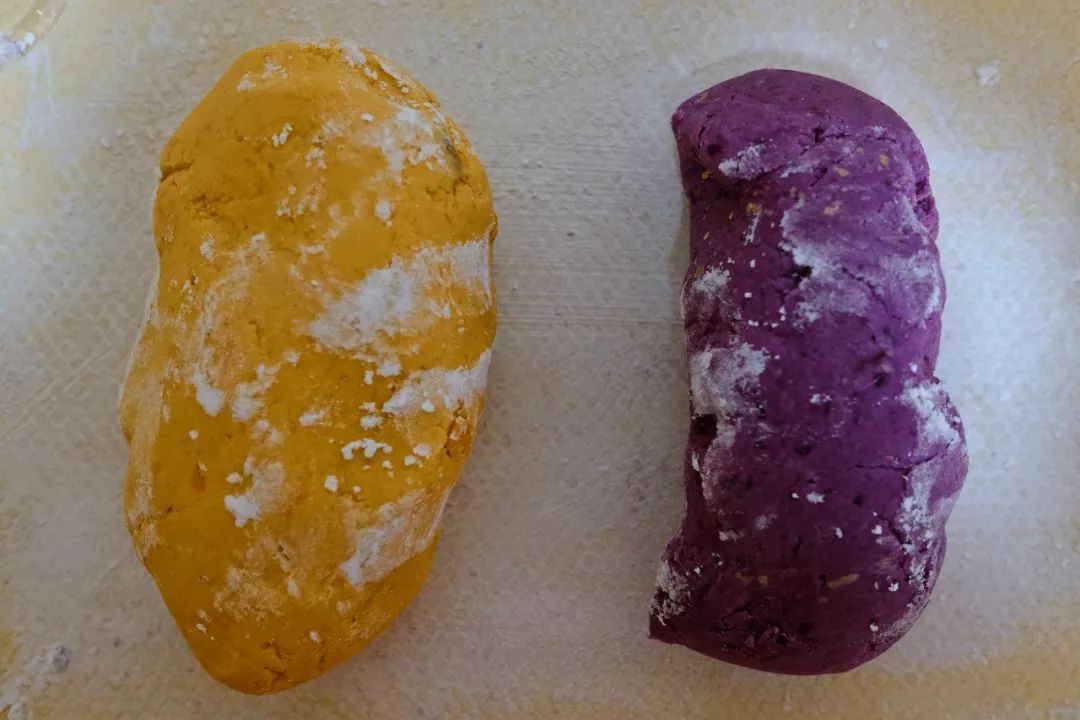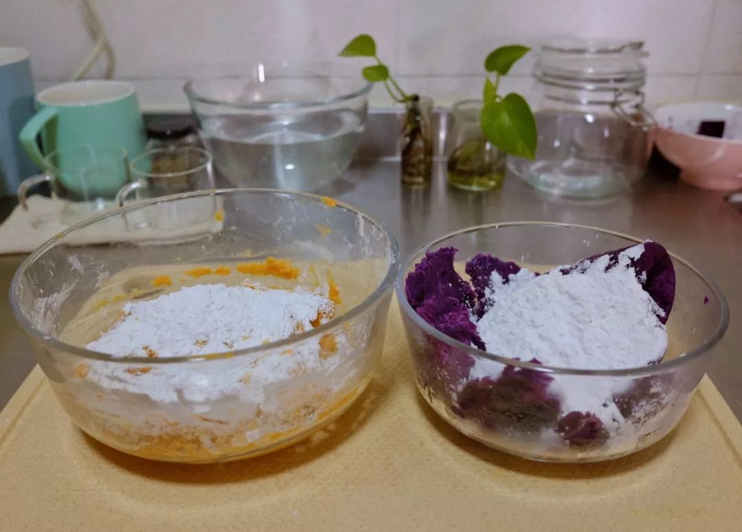 将擀好的红薯泥和紫薯泥分别放进大点的容器,再分别加入适量木薯粉。