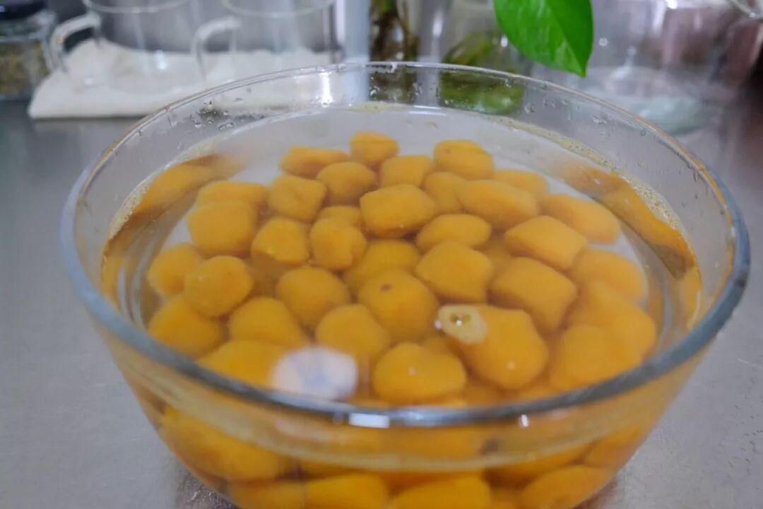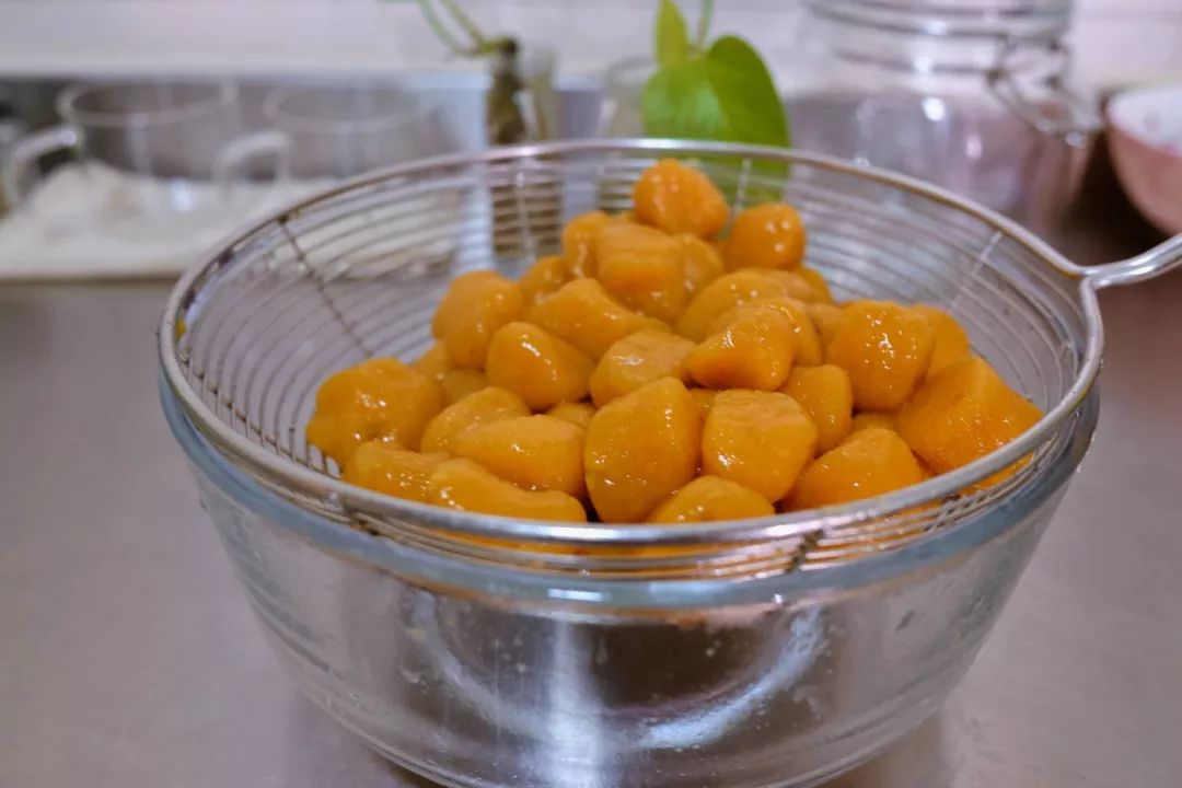 另起锅,烧一锅开水,水开后放入红薯圆煮2分钟左后,捞出放入提前备好的凉水中冰一下(这样薯圆会更Q弹),再捞出控水备用。