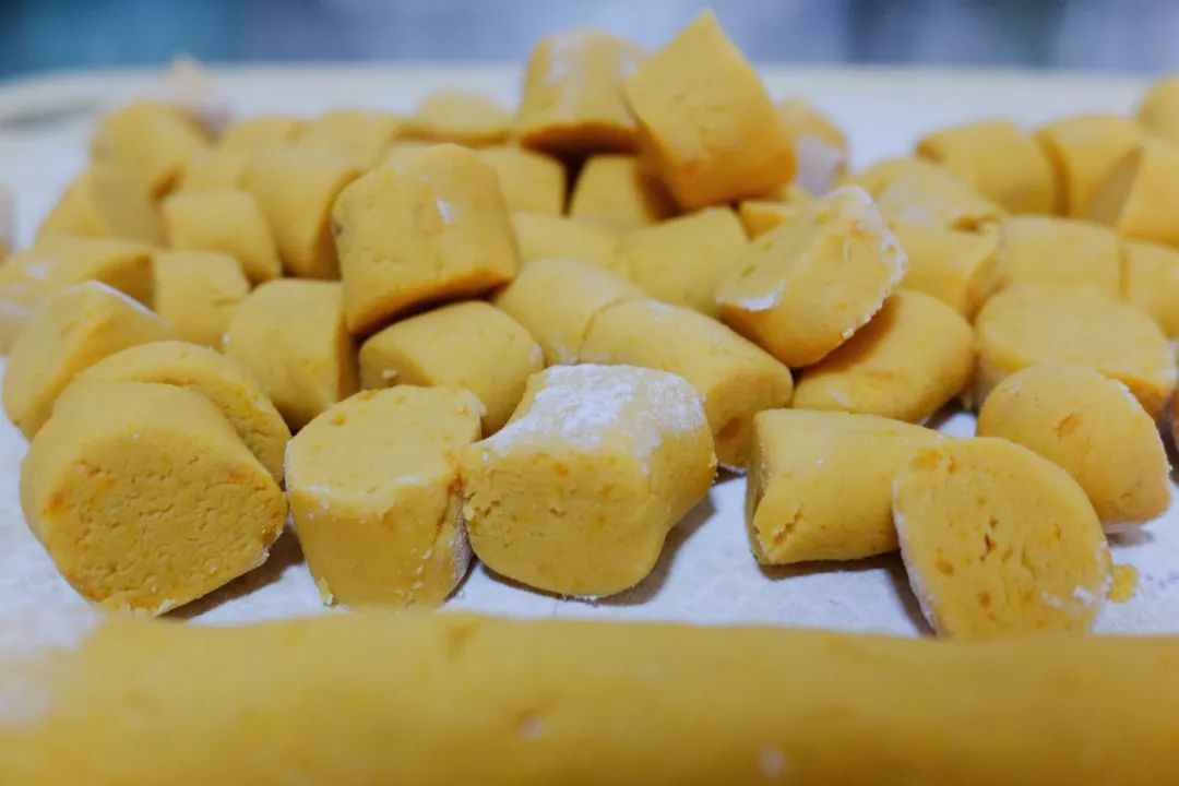 将薯团分成若干份,每一份薯团搓成长条,再切成小圆块,切块后,可撒一些生粉,防止圆块之间粘连。