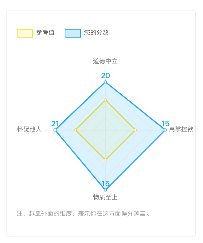 本测试基于马基雅维利的力量,将从物质至上、道德中立、高掌控欲、怀疑他人四个方面剖析你的暗黑人格特质。你将看到自己内在潜藏的力量,并获得关于整合自我、释放生命力的专业建议。