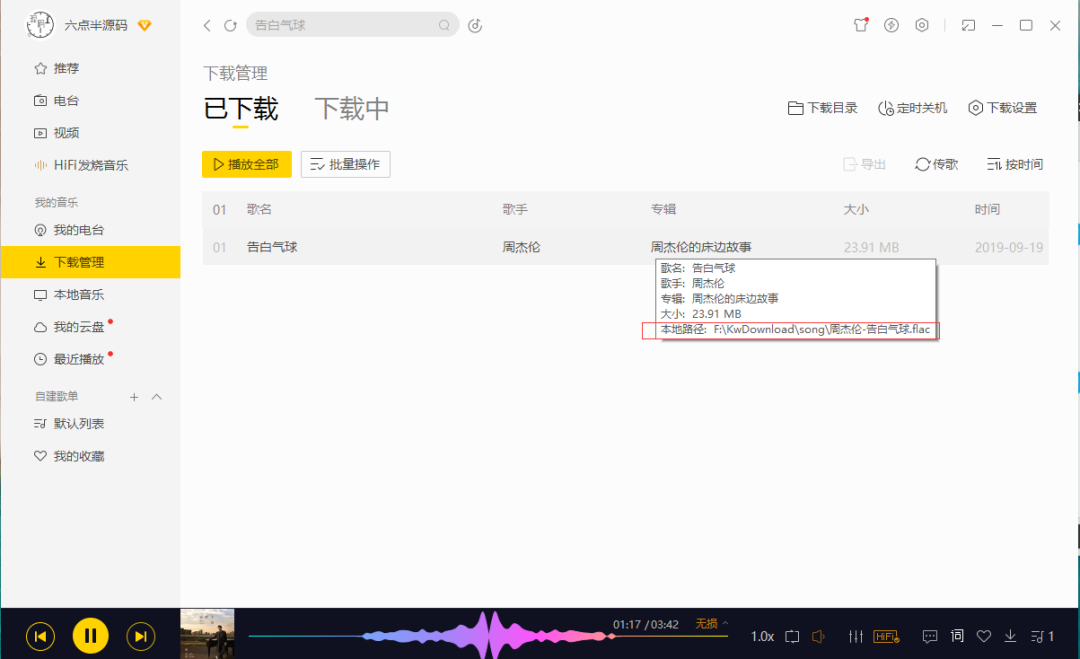 登录后就是豪华V!P,随便搜索一首付费歌曲,点击播放,选择无损音质播放,可以看到没有问题,然后选择无损音质下载,也是没有问题的。