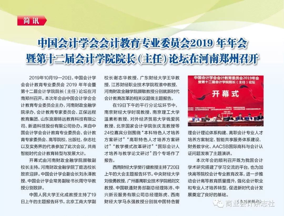 2019年10月19—20日,中国会计学会会计教育专业委员会 2019 年年会暨第十二届会计学院院长(主任)论坛在河南郑州召开。本次年会由中国会计学会会计教育专业委员会主办,河南财政金融学院承办,会计教育专家委员会、正保远程教育集团、山东浪潮铸远教育科技有限公司、新道科技股份有限公司协办。来自中国会计学会会计教育专业委员会、会计教育专家委员会、高等院校、出版社、杂志社以及实务界的代表参加了此次会议,共商智能时代会计教育转型与发展大计。